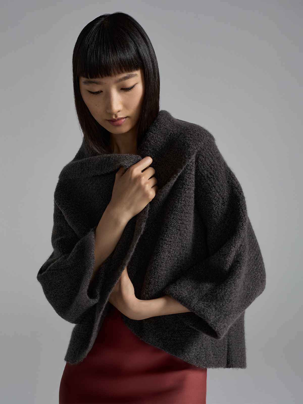 A transformative layer in bouclé cloud yarn, this cardigan shifts from opera-style elegance to a sculptural drape when inverted. Spun from cashmere, silk, and wool, it offers lightness, texture, and softness that carries effortlessly through time.