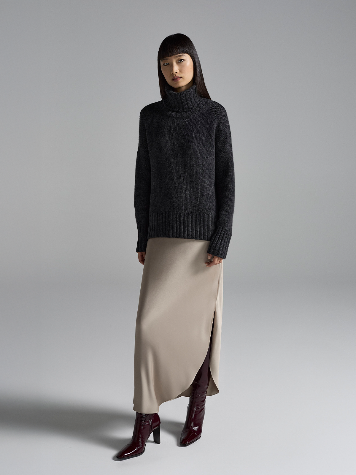 A relaxed turtleneck in feather-light cashmere, defined by dropped shoulders and a gently curved hem. Italian-crafted for softness and ease, it balances comfort with timeless French elegance.