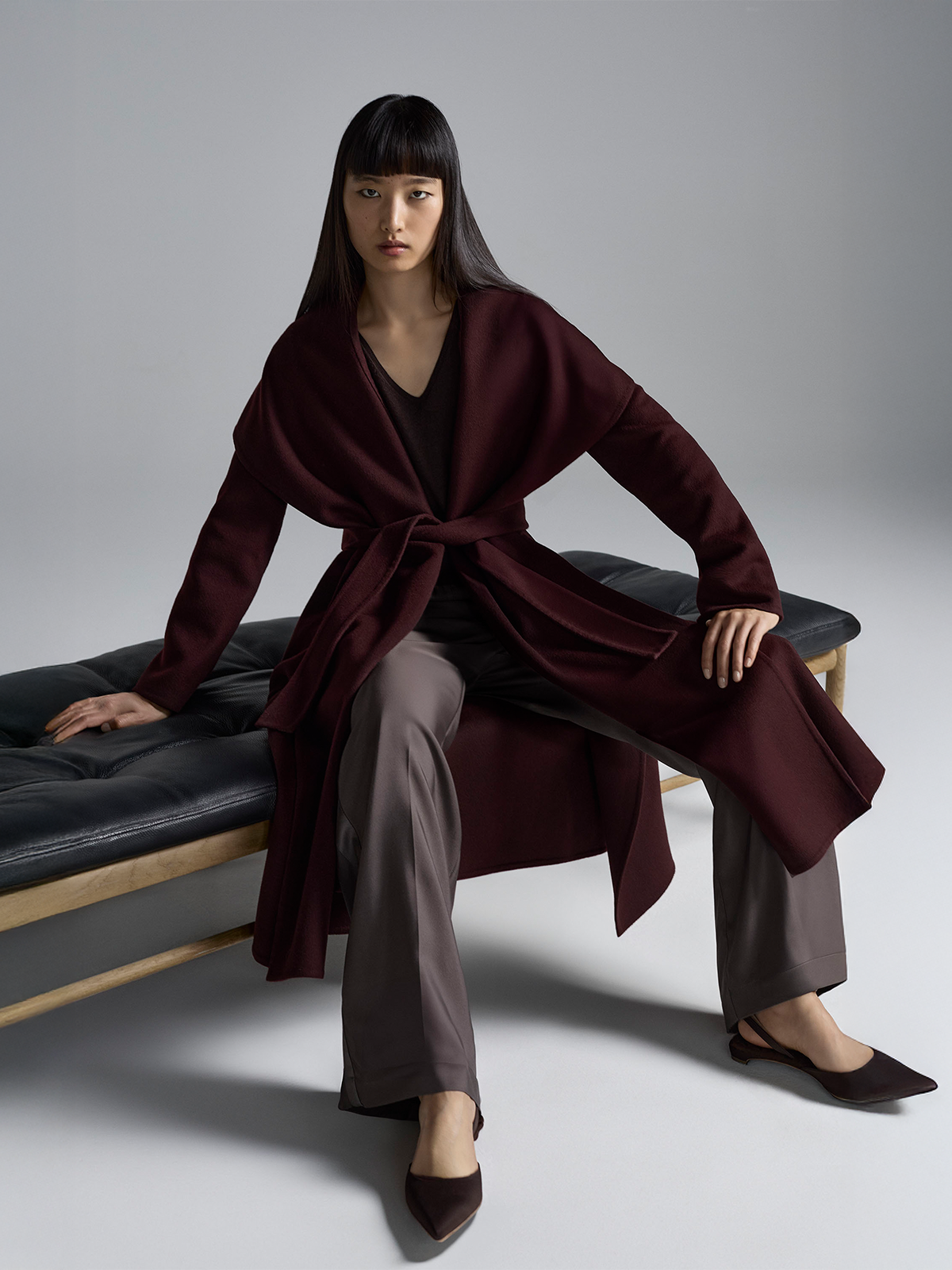 Pure cashmere defined by a sweeping shawl collar and hand-finished edges. Parisian-crafted with understated drama, it carries the ease of French luxury and the permanence of a forever piece.