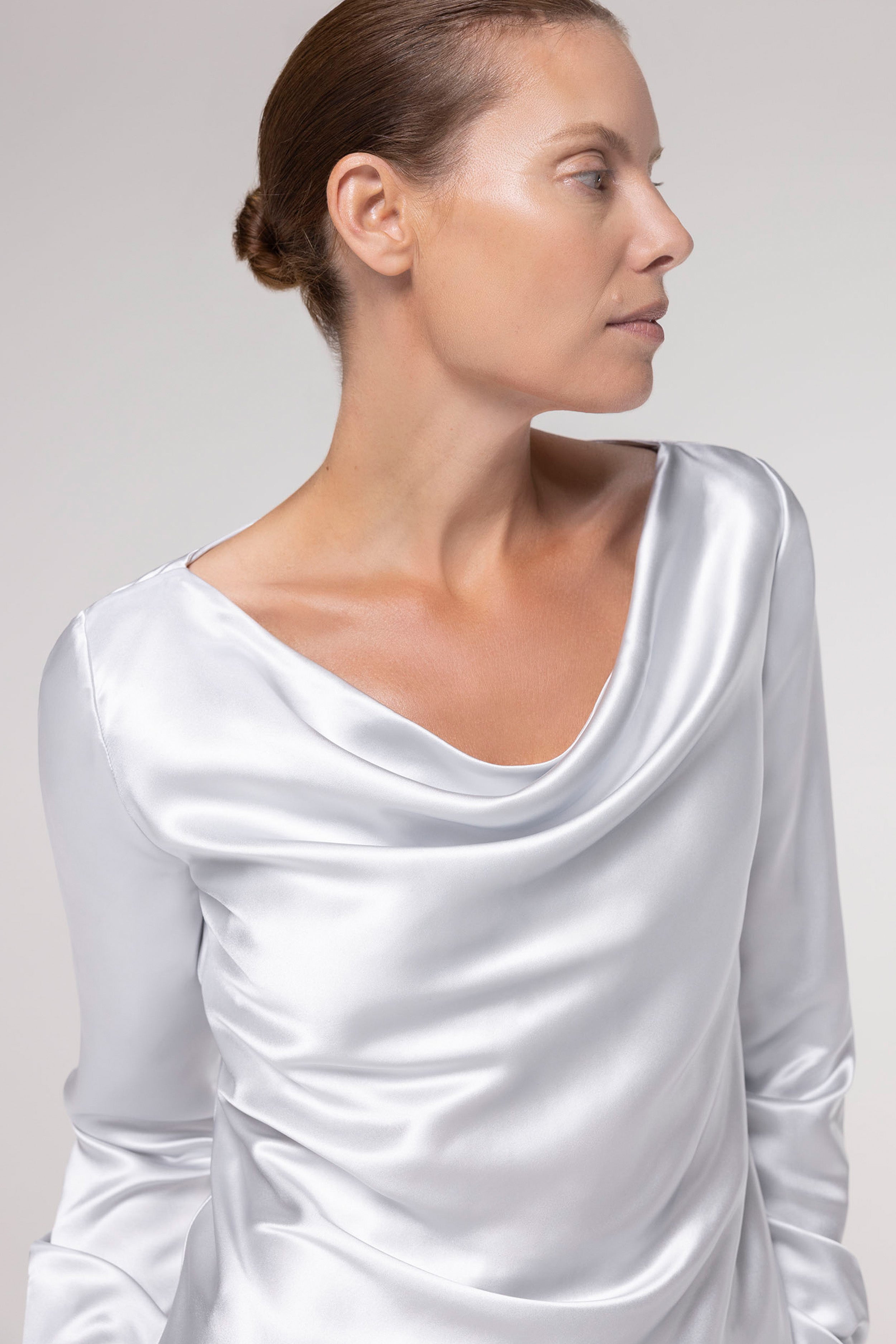 Our Salon Drape-Neck Top is a versatile essential, perfect for any occasion. It is available in two fabrics: the fluid, light-reflecting elegance ofSilk Satin, and the more structured, matte refinement of Cady Silk.