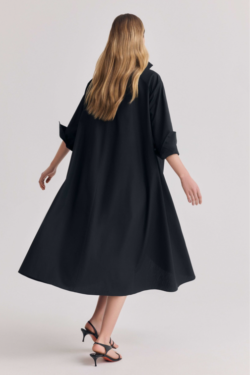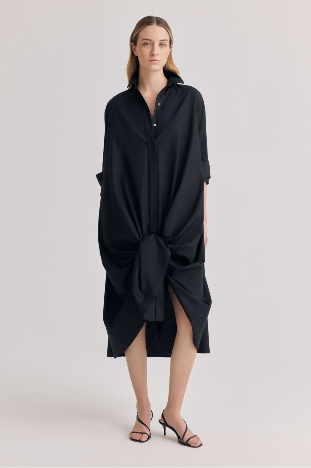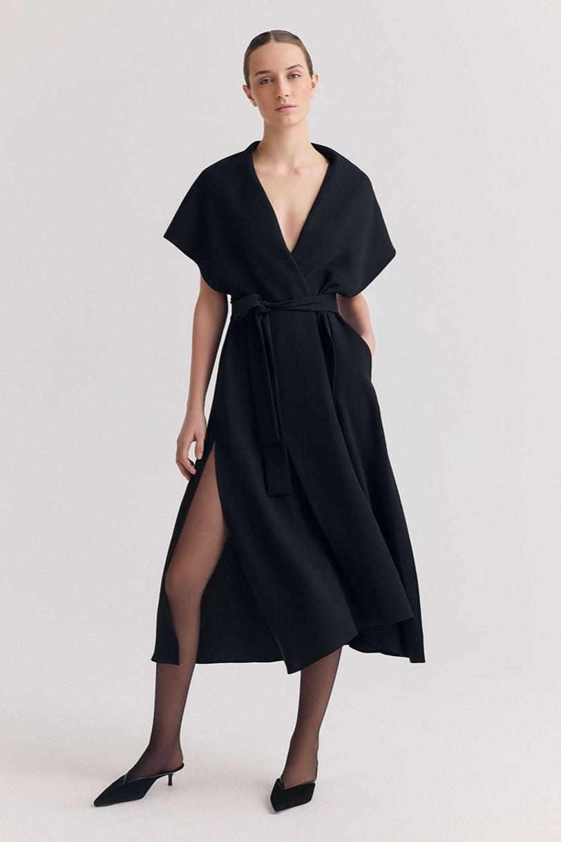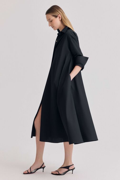 Our cady silk duster shifts with ease between layers and occasions. With its fluid silhouette and sweeping collar, it becomes a polished coat—styled open or closed—over silk separates, or a stand alone dress with quiet drama.