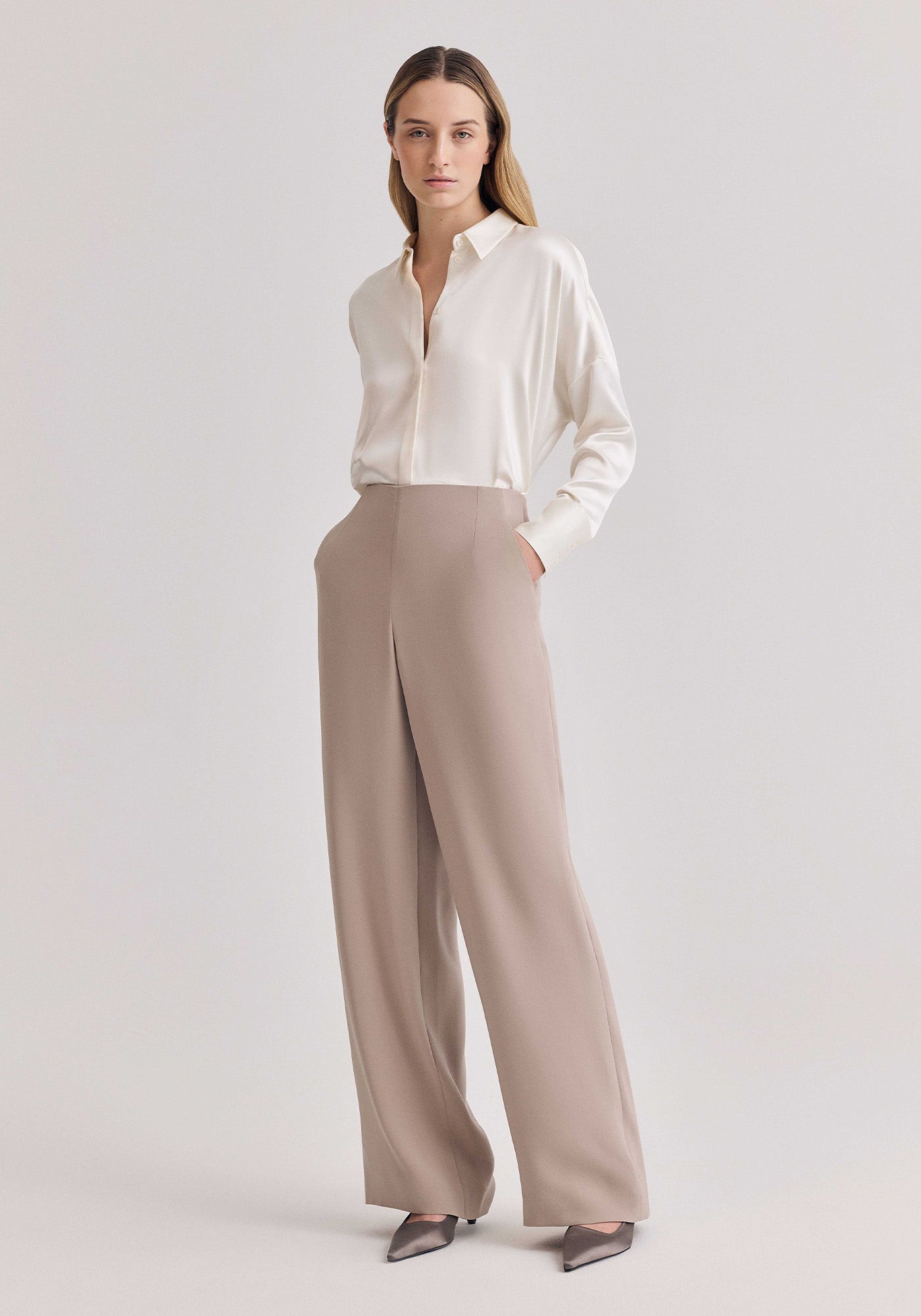 This trio offers endless versatility in silk and satin neutrals. The Silk Camisole pairs a gently flared silhouette with delicate crisscross straps, perfect for layering or wearing solo. The Wide-leg Salon Pant, finished with silk piping, delivers a fluid drape and all-day comfort—an effortless foundation piece for any look. Completing the story, the Oversized Silk Chemise Dress moves seamlessly between roles: buttoned and belted, it’s an effortlessly chic dress; worn open, it transforms into a dramatic, opera-coat layer.