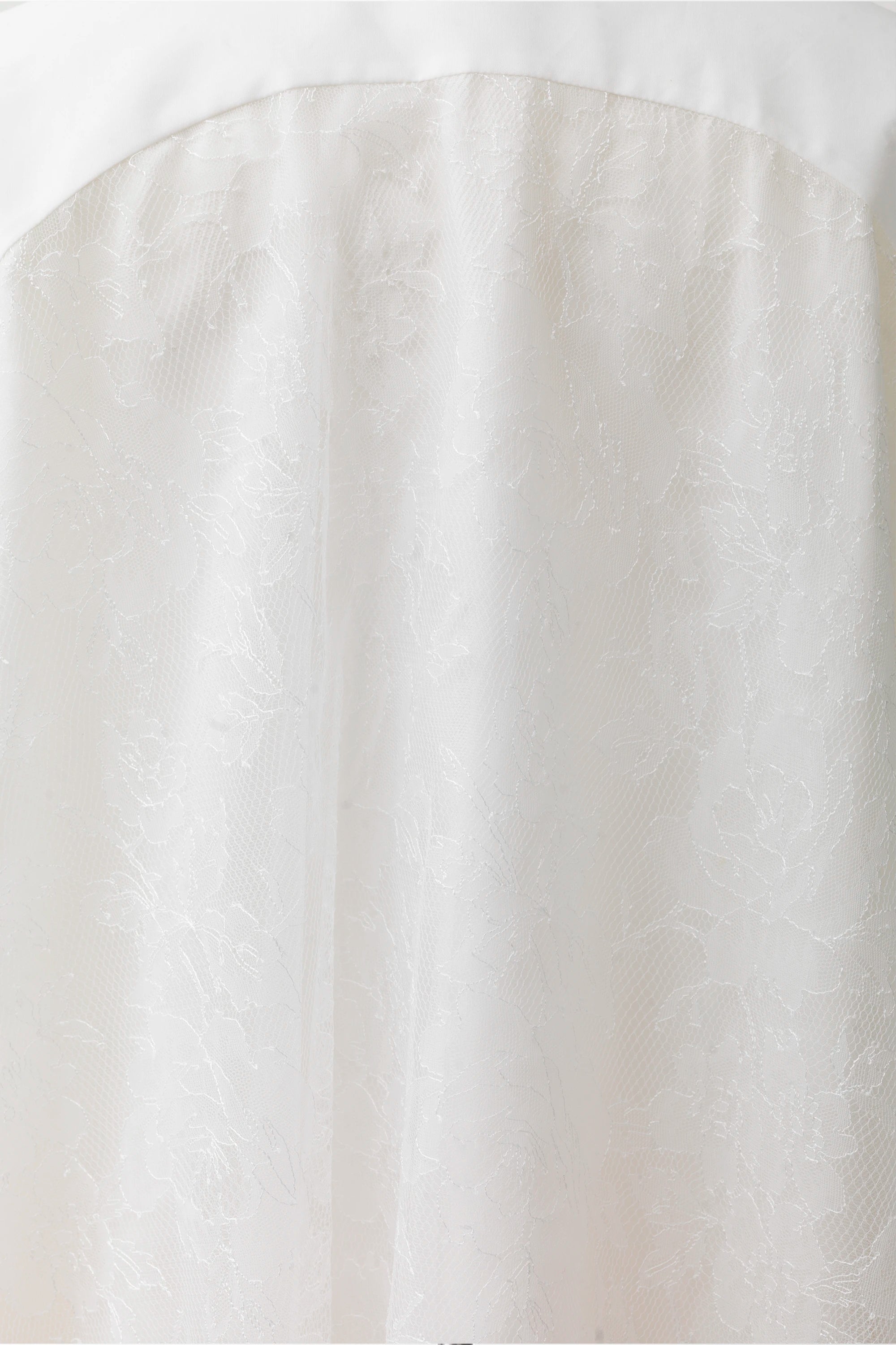 Our cotton and lace shirt blends structure with fluidity. Featuring a layered lace back for airy movement and subtle transparency, it pairs effortlessly with layering pieces. The tailored front with a covered placket and refined French cuffs contrasts the flowing lace, creating a striking silhouette perfect for day-to-evening transitions.